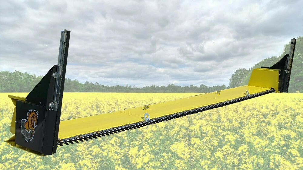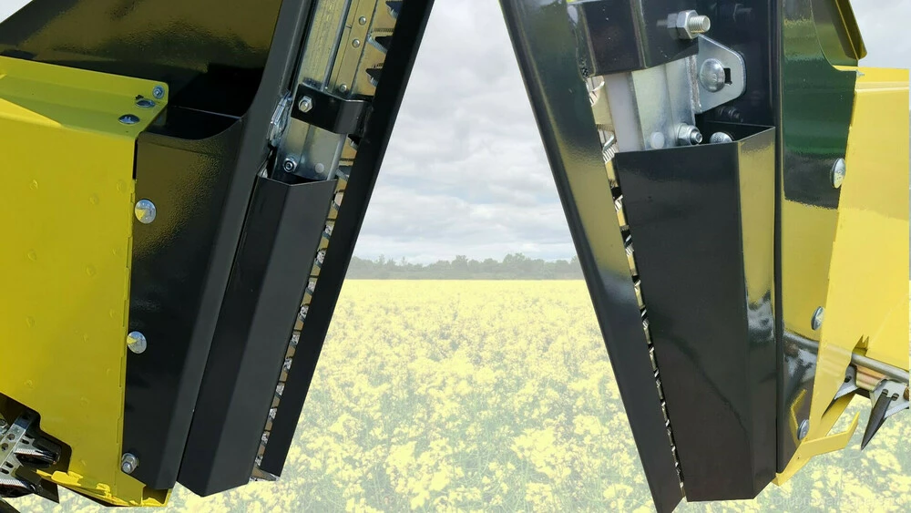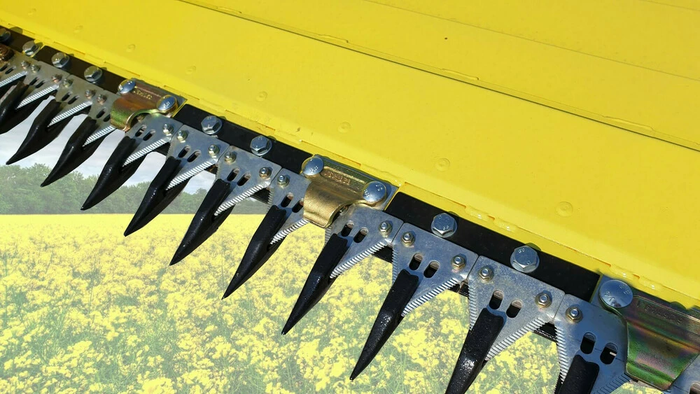 - Бічний дільник ріпакового столу складається з двох активних ножів, а не одного. Подвійний сегмент на бічному дільнику в парі з двома активними ножами забезпечує якісний зріз рослини за рахунок підвищеної частоти зрізу. Така конструкція дозволяє усунути розгойдування пристосування і зменшити вібрацію. Тепер немає необхідності встановлювати на ріпаковий стіл дорогого електричного або гідравлічного активного дільника, оскільки швидкості зрізу бічних ножів вистачає із запасом, незалежно від стану рослини.